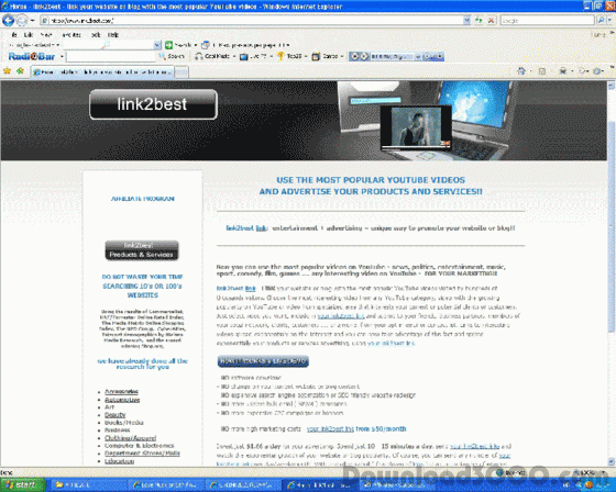 USE THE MOST POPULAR YOUTUBE VIDEOS FOR YOUR WEBSITE OR BLOG MARKETING! Now you can use popular videos on YouTube – news, politics, music, sport .. any interesting video on YouTube - FOR YOUR WEBSITE PROMOTION - WITHOUT VIOLATING "CAN SPAM Act". "LINK2BEST LINK": entertainment + advertising = unique way to promote your website or blog!! www.link2best.com - LINK your website or blog with the most popular YouTube videos visited by hundreds of thousands visitors. Choose the most interesting video from any YouTube category, video with the growing popularity on YouTube or video from specialized area that interests your current or potential clients or customers. Just select video you want, include in your "LINK2BEST LINK" and submit to your friends, business partners, members of your social network, clients, customers .... or or anyone, from your opt-in email or contact list. On this way you can spread ANY number of links to your website or blog without violating "CAN SPAM Act". - NO more high marketing costs - NO expensive search engine optimization or SEO friendly website redesign - NO more useless bulk email ( SPAM ) campaigns - NO more expensive CPC campaigns or banners - NO change on your current website or blog content - NO software download Spend just 10 - 15 minutes a day, send your "LINK2BEST LINK" and watch the exponential growth of your website or blog popularity. Of course, you can send any number of your "LINK2BEST LINK" per day/week/month. With a small snowball ( few dozen of links ) start an avalanche of internet visitors on your website or blog. Sit back and watch how others between their contacts or between their friends on social networks share your website or blog promotion and build ( for free ) YOUR promotion network. Exchange of interesting videos is a common activity for millions of people. Did you know that YouTube serves up over 200 million video clips per day?